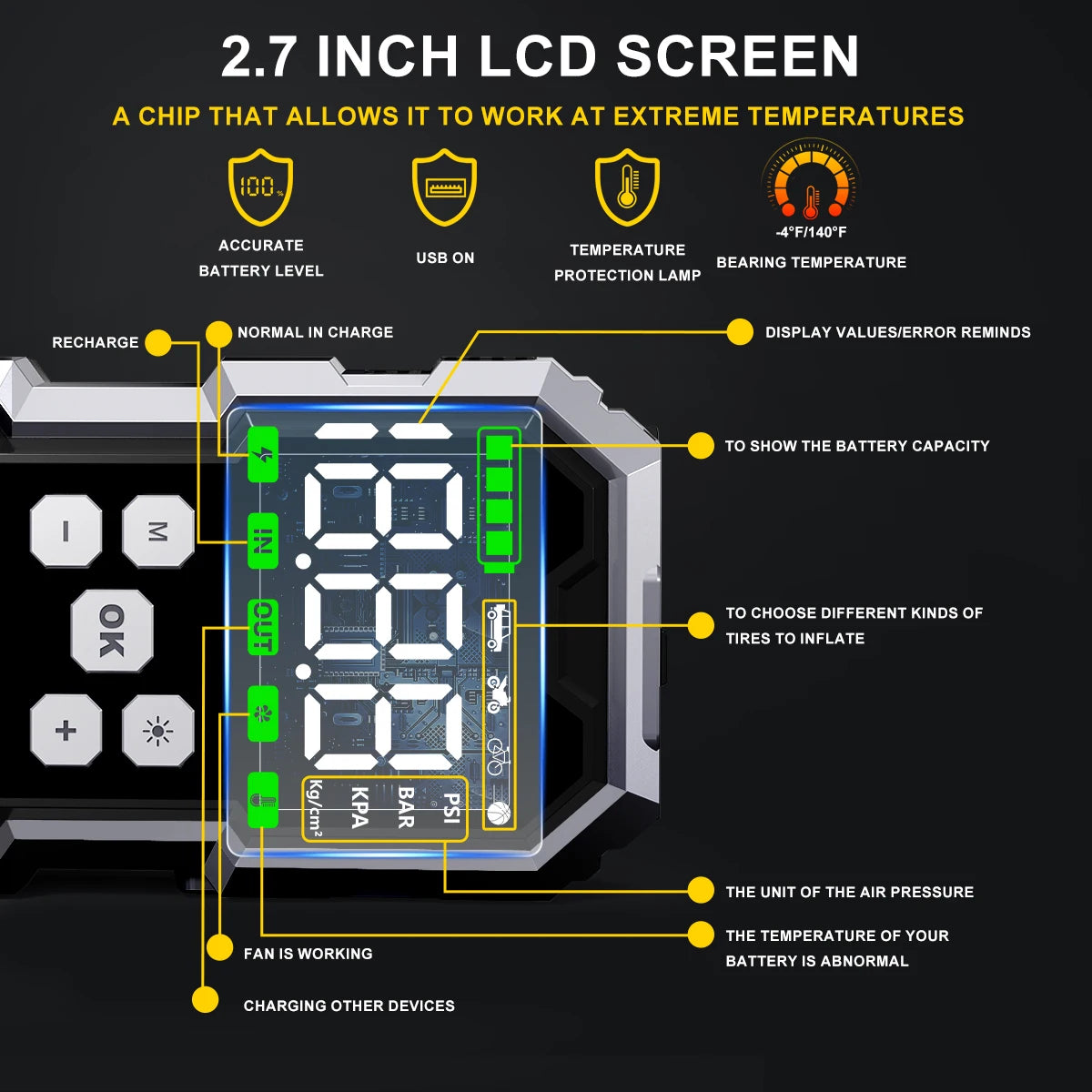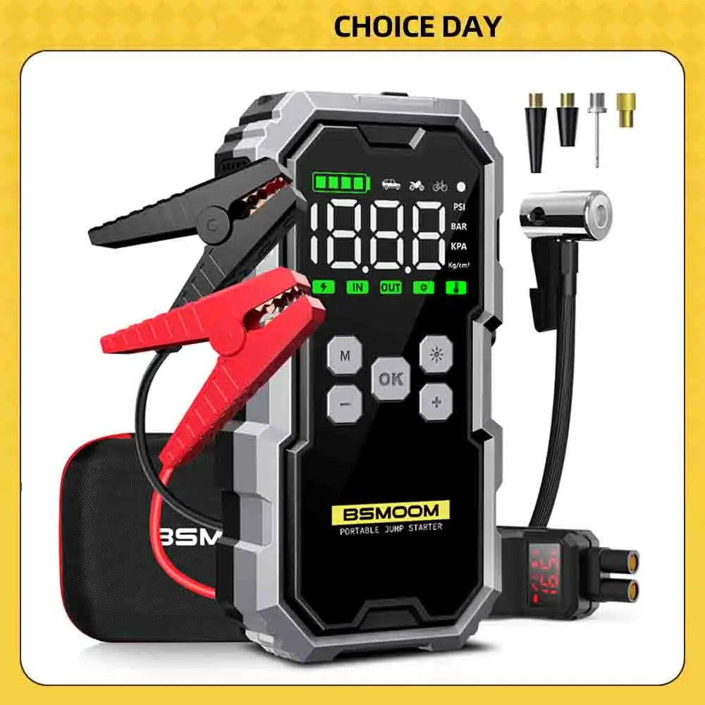 SMART DIGITAL TIRE INFLATION FUNCTION: The BSMOOM jump starter battery pack features an LED smart screen and advanced tire pressure detection, providing crucial information such as battery level, inflation mode, and real-time tire pressure. Supporting four units (PSI, BAR, KPA, KG/CM), the 150PSI air compressor efficiently inflates a normal car tire to 20PSI in about one minute, making it easy to use and highly convenient.
