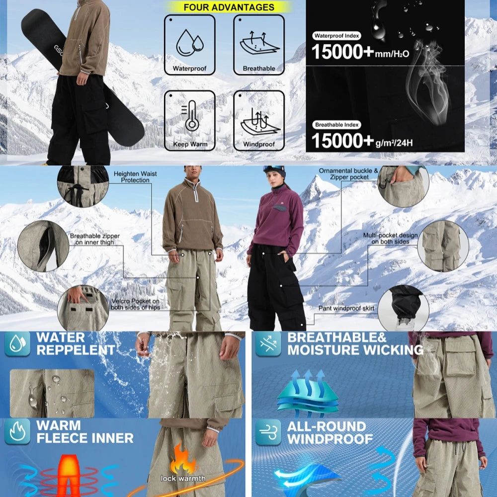 Baggy Snowboard Pants by Dollplus – Multi-Pocket, Windproof & Thermal Ski Wear
