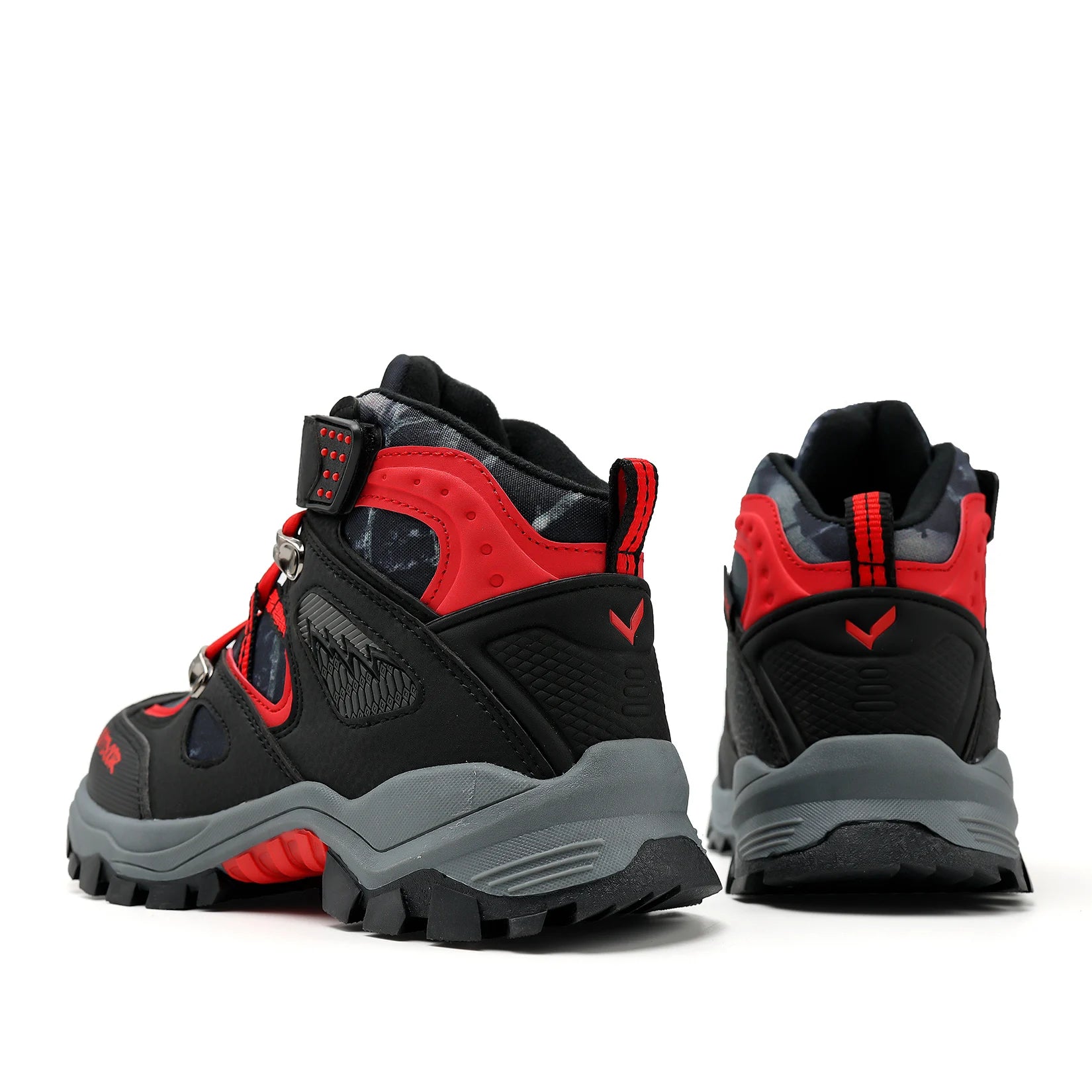 Kids hiking boots with Artificial leather + suede + PU+ mesh and tear resistant fabric upper. The boys hiking boots lining is made of high quality warm plush/soft mesh inside, soft and comfortable, warm and breathable, and windproof.