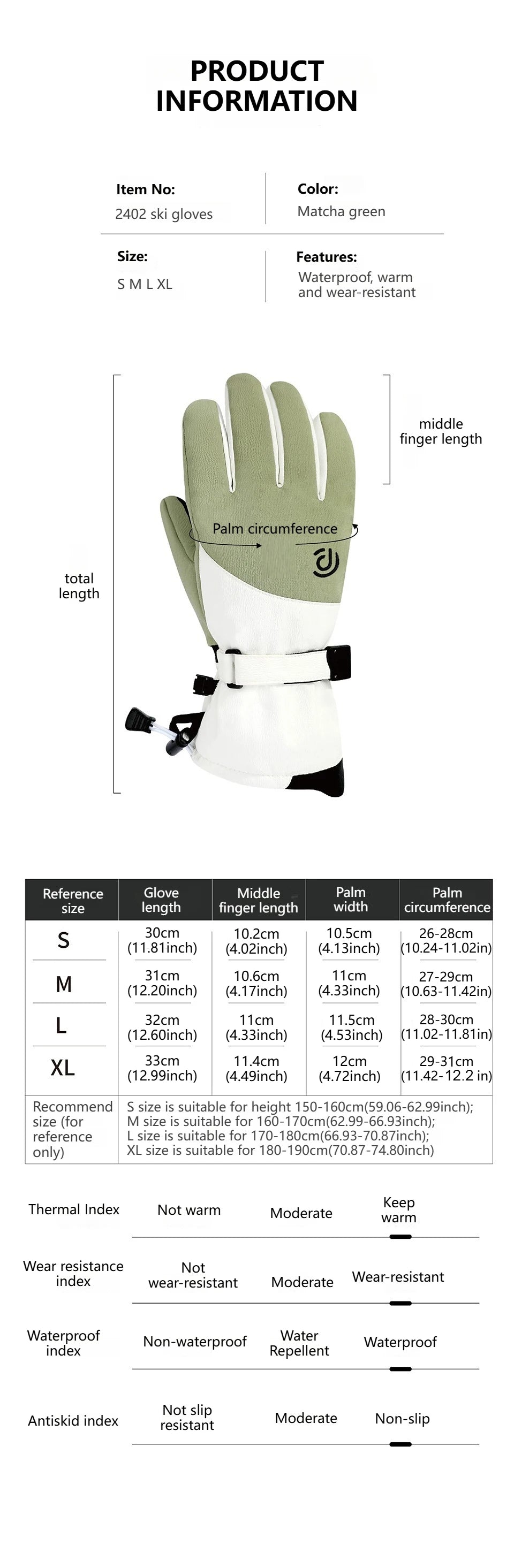 M: Gloves length 31cm, Middle finger length 10.6cm, Palm width 11cm, Paml circumference 27-29cm