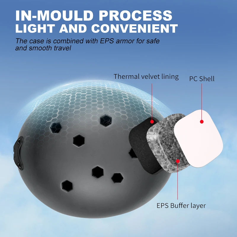 PC and EPS structures in accordance with EN 1077 - This helmet has two reinforcement layers. The outer cover is made of PC material and the outer shell is double-protected by the supporting EPS outer shell. This helmet is fully EN1077 compliant and CE certified.