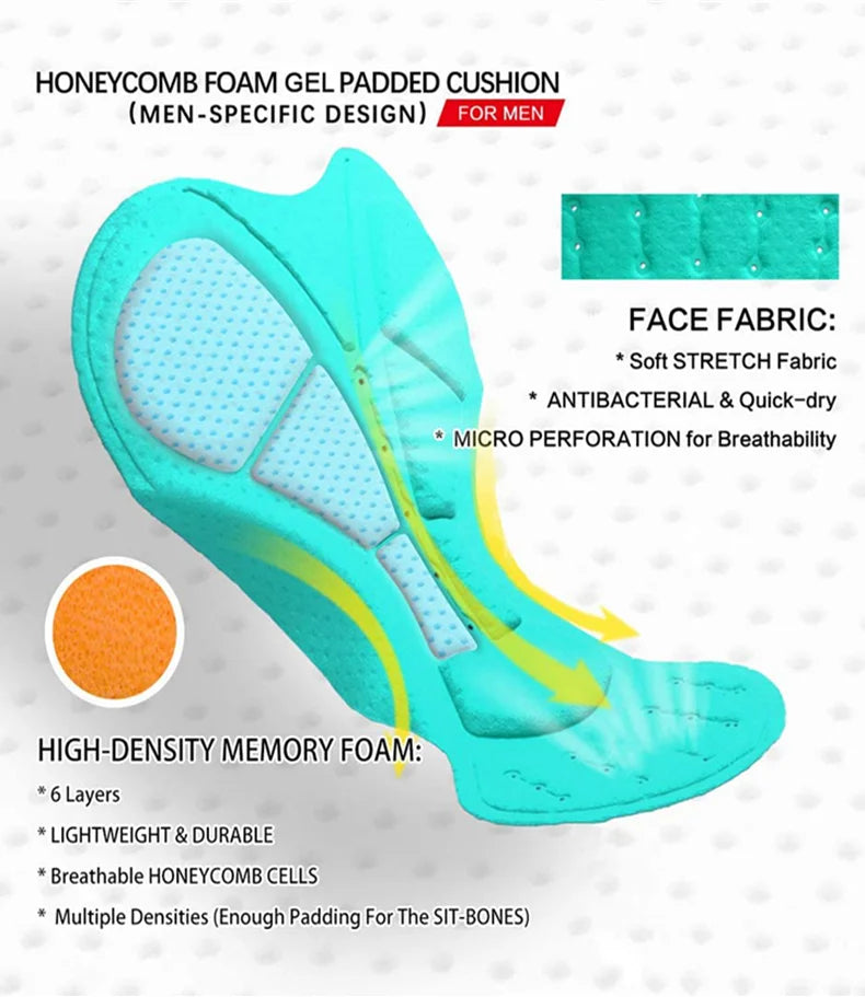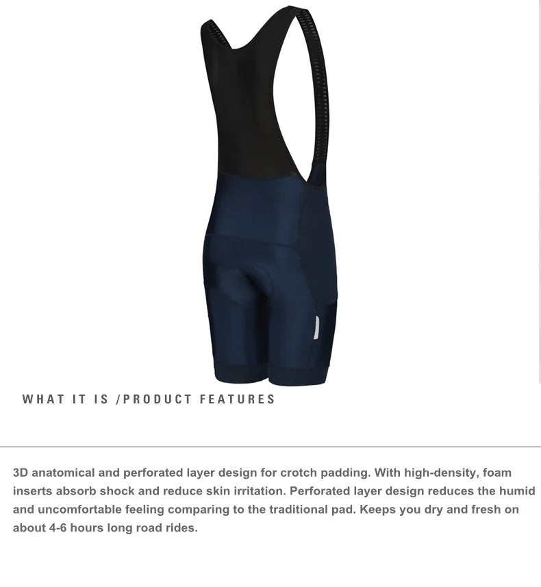 【Long Distance Riding】-3D anatomical and perforated layer design for crotch padding. With high-density, foam inserts absorb shock and reduce skin irritation. Perforated layer design reduces the humid and uncomfortable feeling comparing to the traditional pad. Keeps you dry and fresh on about 4-6 hours long road rides.
