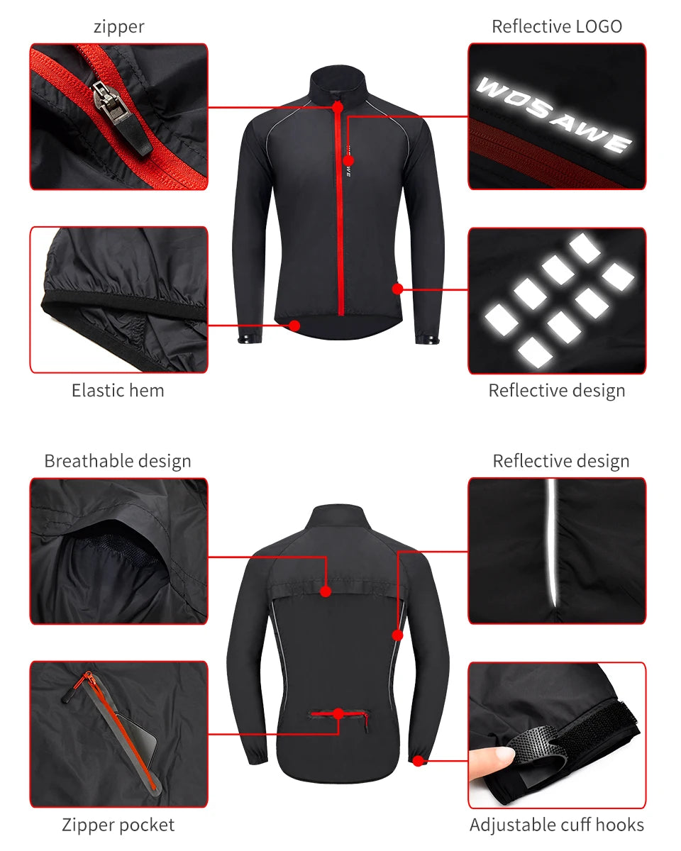 WOSAWE Men Windproof Waterproof Reflective Cycling Jacket MTB Bicycle Long Sleeve Windbreaker Sleeveless Vest Bike Coat Jersey